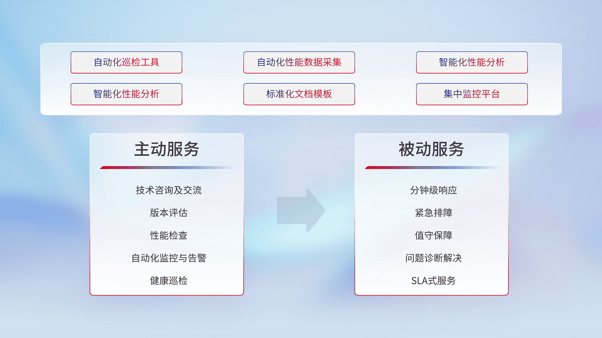 智能化工具和标准化文档,,保障服务质量,,,提供主动服务(包含技术咨询、、、版本评估、、、性能检查、、自动化监控与告警、、健康巡检)和被动服务包含(分钟级响应、、、、紧急排障、、值守保障、、、、问题诊断解决、、SLA服务)。。